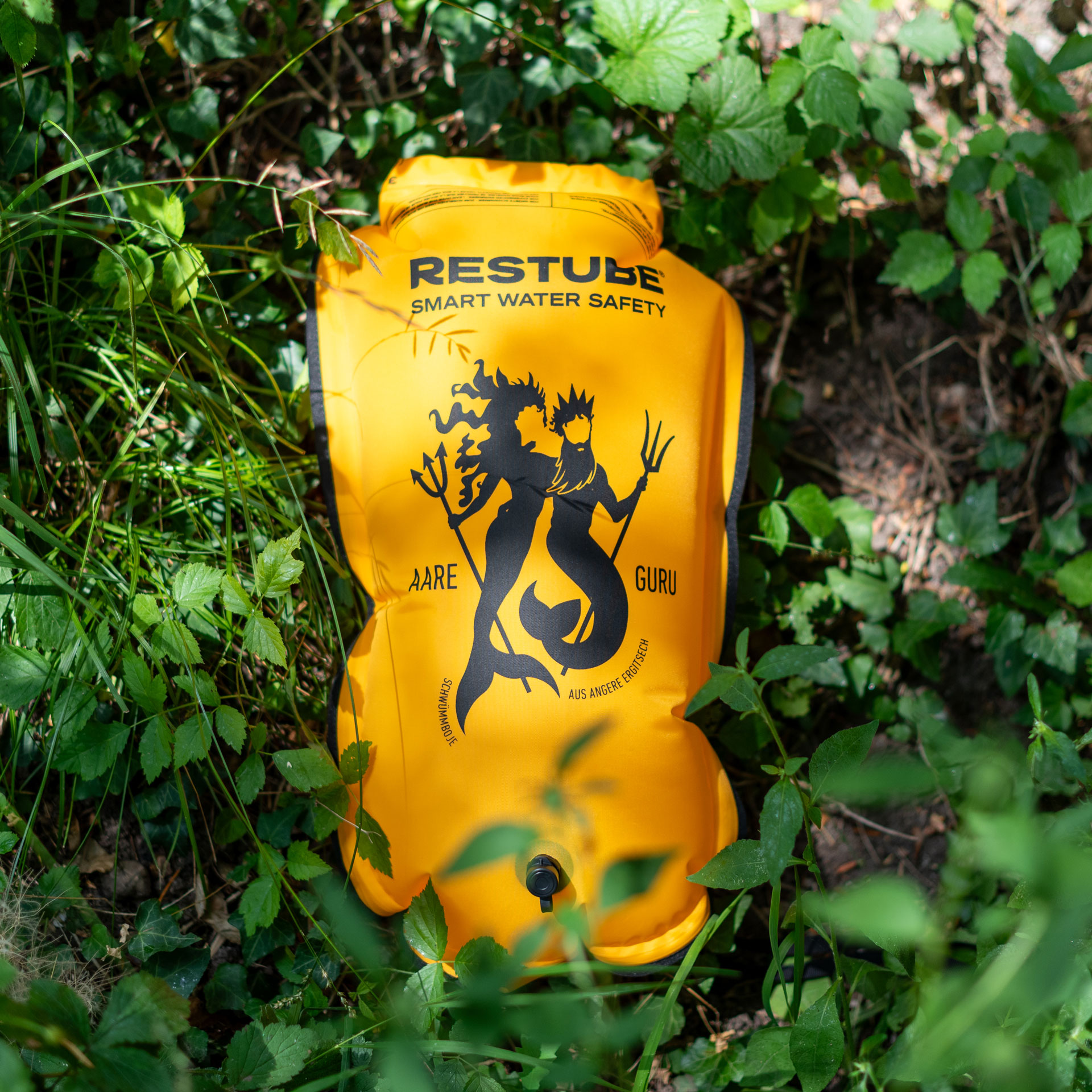 Die Schwimmboje von Restube hat zwei Kammern. Eine für die Kleider (12 l) und eine für die Luft (125 N). Somit ist der Aarebag kombiniert mit einem Schwimmkissen. Mit der Aare Guru Schwimmboje hast du deine Kleider dabei und kannst das Teil als Boje benutzen und dich drauflegen, wenn du dich lieber treiben lassen willst. Damit hast du also ein Aare Bag, der auch eine Schwimmboje ist, oder eine Schwimmboje, die auch ein Aare Bag ist!
